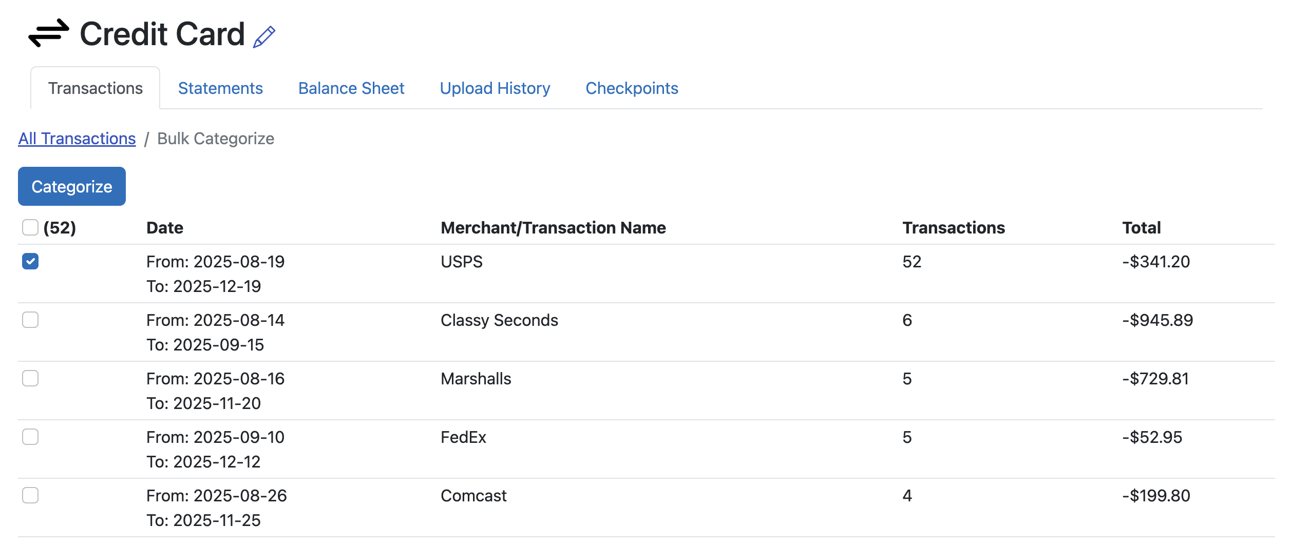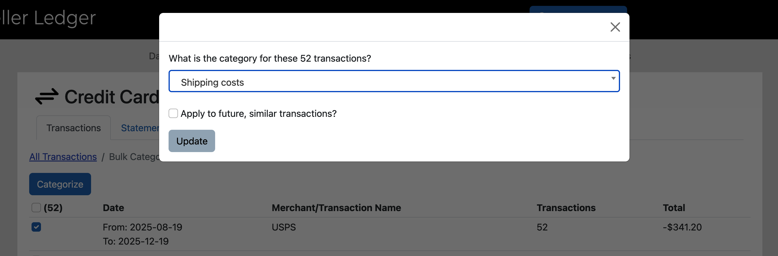 Not only will you have just categorized the largest number of transaction in your credit card account, but any USPS purchases that get downloaded in the future will also automatically be categorized. Seller Ledger learns and gets smarter the more you use it.